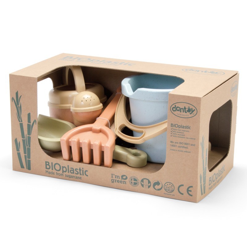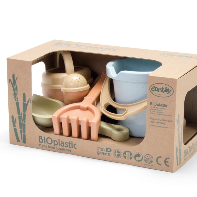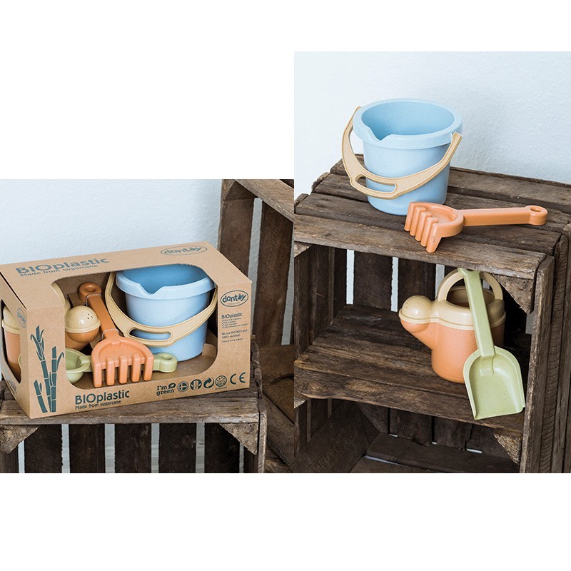 BIO set de arena y agua. 4 piezas. Cubo> pala> rastrillo y regadera. 90% de Biobase> 100% reciclable y 100% sostenible.