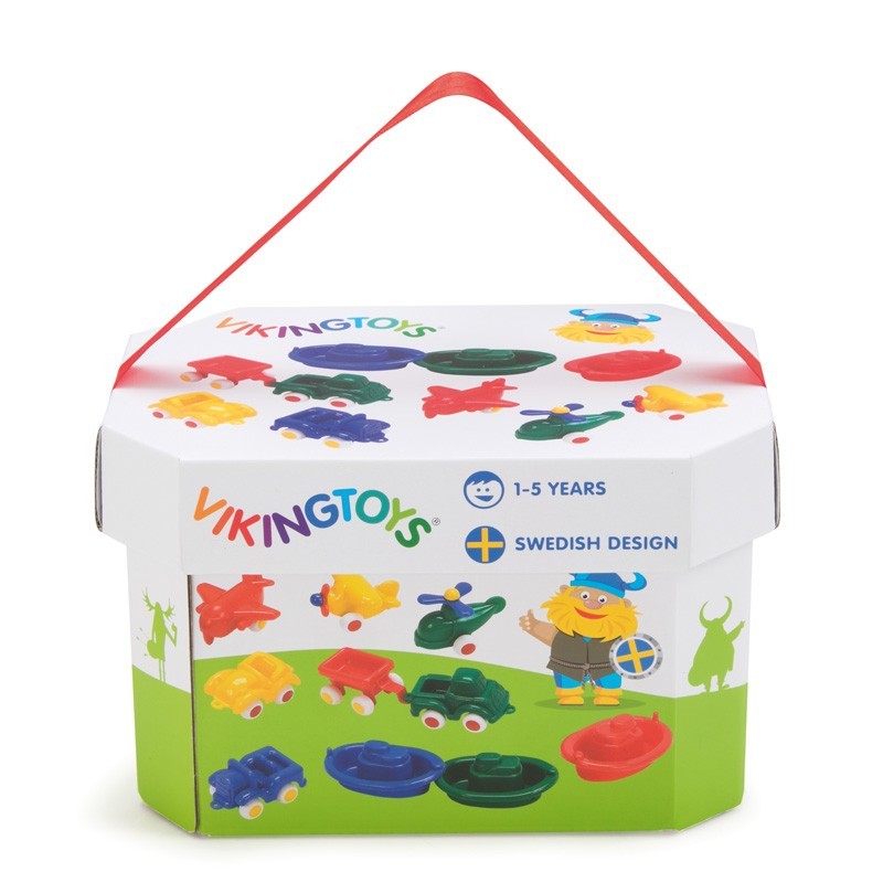 Caja de tapa transparente con 10 mini chubbies de polipropileno flexible. Contiene barcos> coches> remolque> aviones y helicóptero. 7 cm.