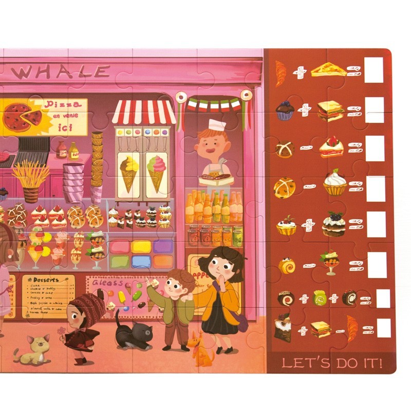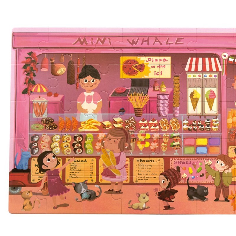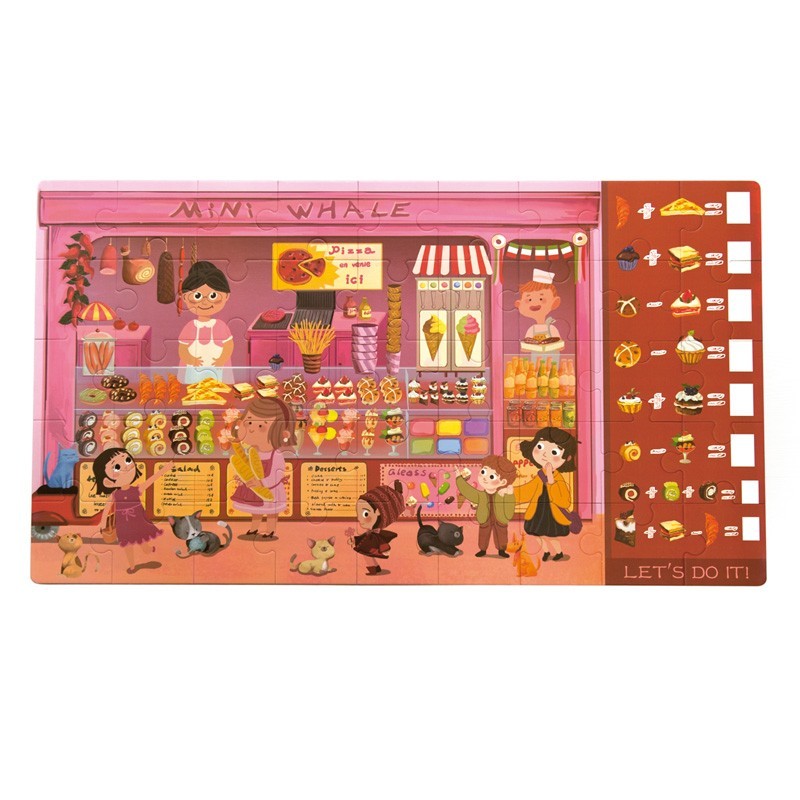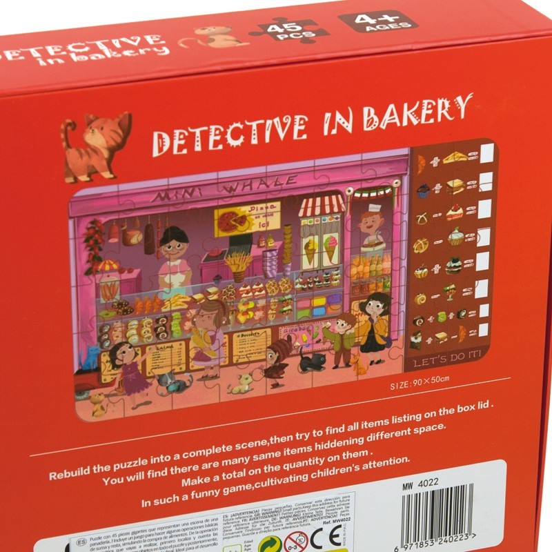 Puzzle con 45 piezas gigantes que representan una escena de una panadería..! Incluye un juego para hacer algunas operaciones básicas de suma y resta> simulando la compra de alimentos. De la operación matemática que vayas a realizar> primero localiza y cuenta las unidades que hay de esos objetos en todo el puzzle y posteriormente> suma o resta para obtener el resultado final. Ideal para el desarrollo de las primeras operaciones matemáticas. 90X50cm.