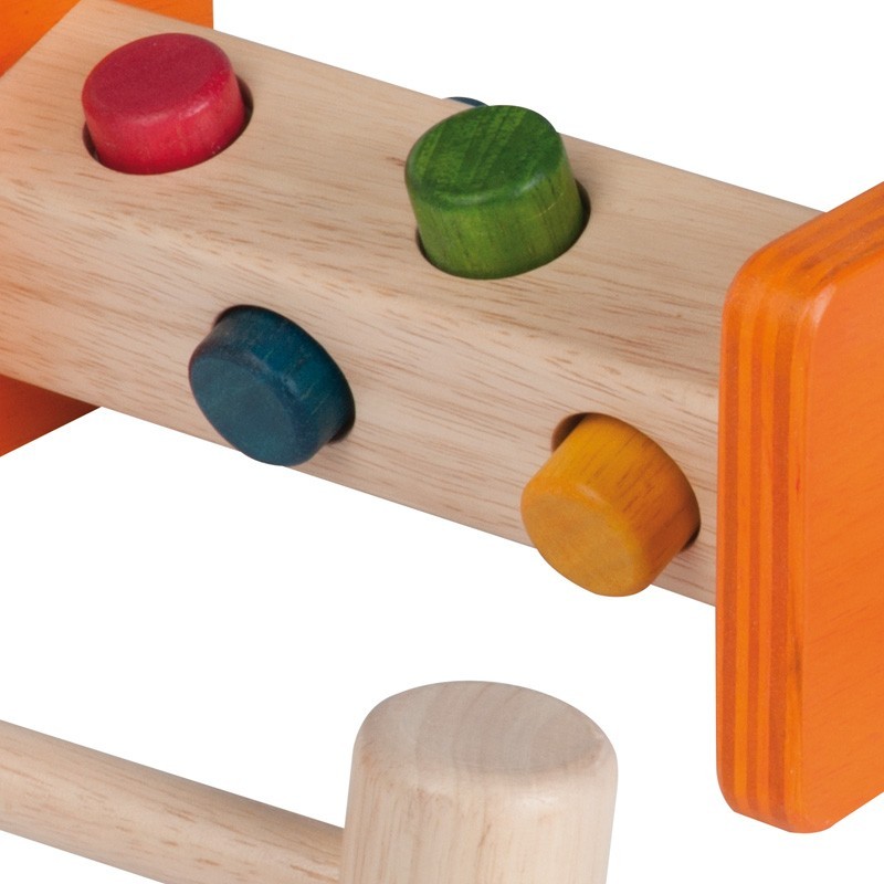 Diviértete jugando con este “juego del martillo” de madera natural y con un toque de color a base de tintes hechos de extractos botánicos naturales. El bebé jugará a golpear la clavija por ambos lados con un martillo de madera. Este juego ayudará a mejorar la coordinación mano-ojo y la motricidad fina.