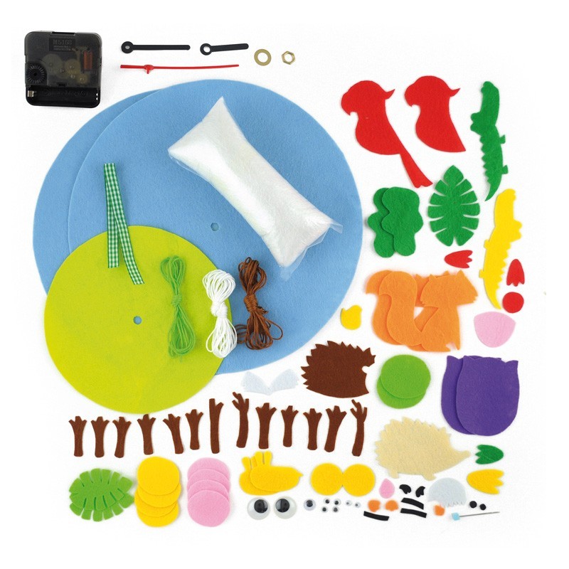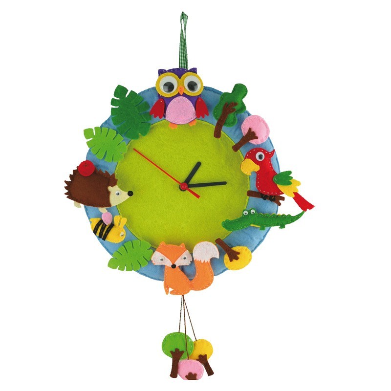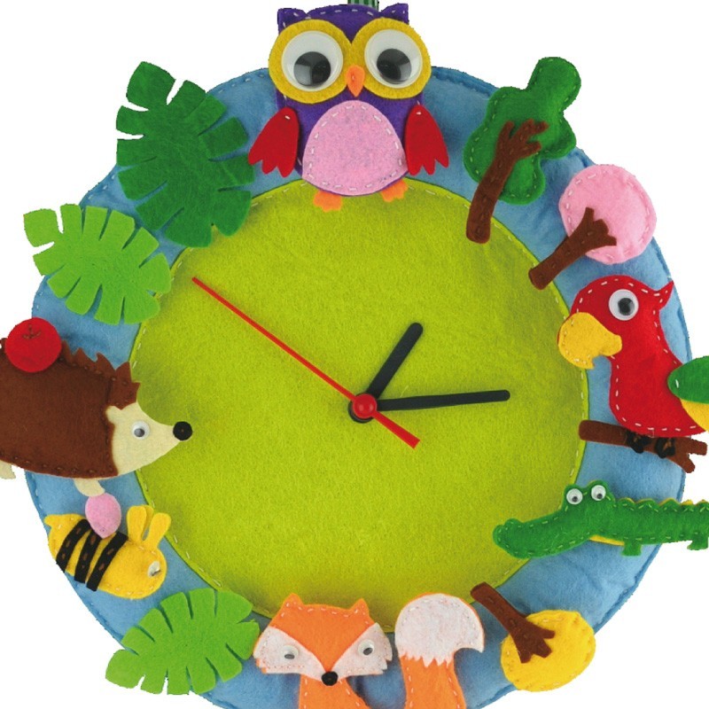 Cose las piezas de fieltro para decorar el reloj. Contenido: Fieltro> mecanismo de reloj> cinta> ojos saltones divertidos> relleno> aguja y cordones.