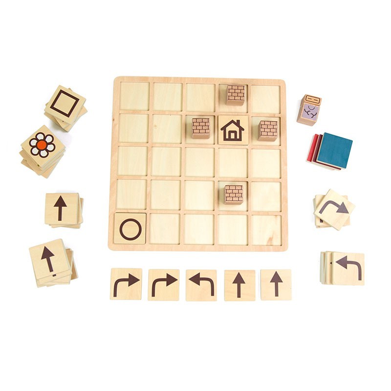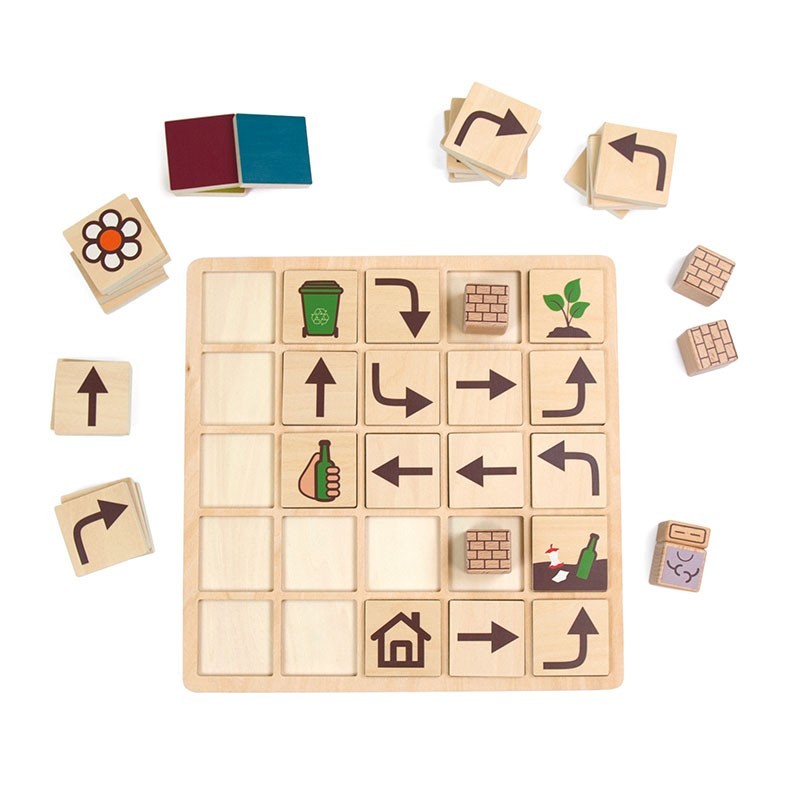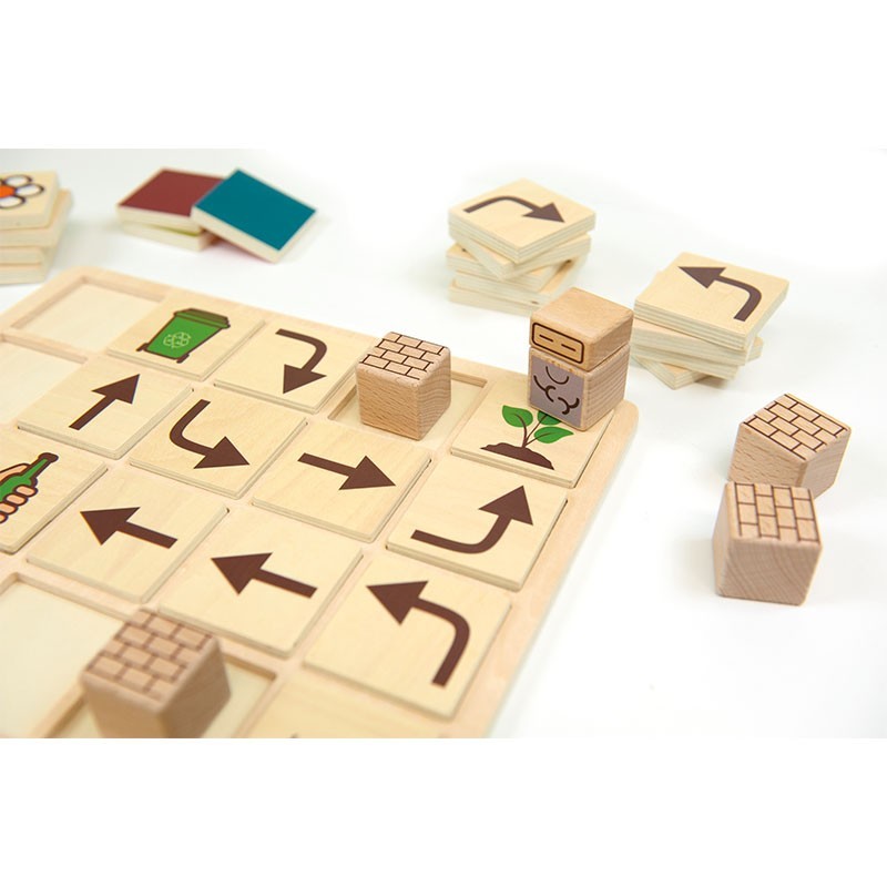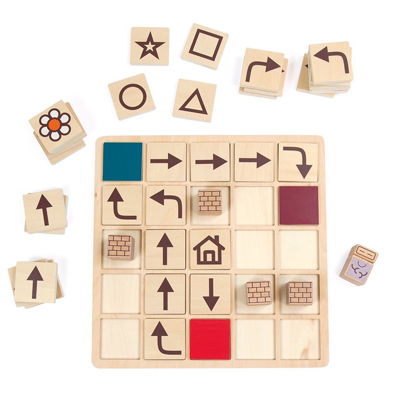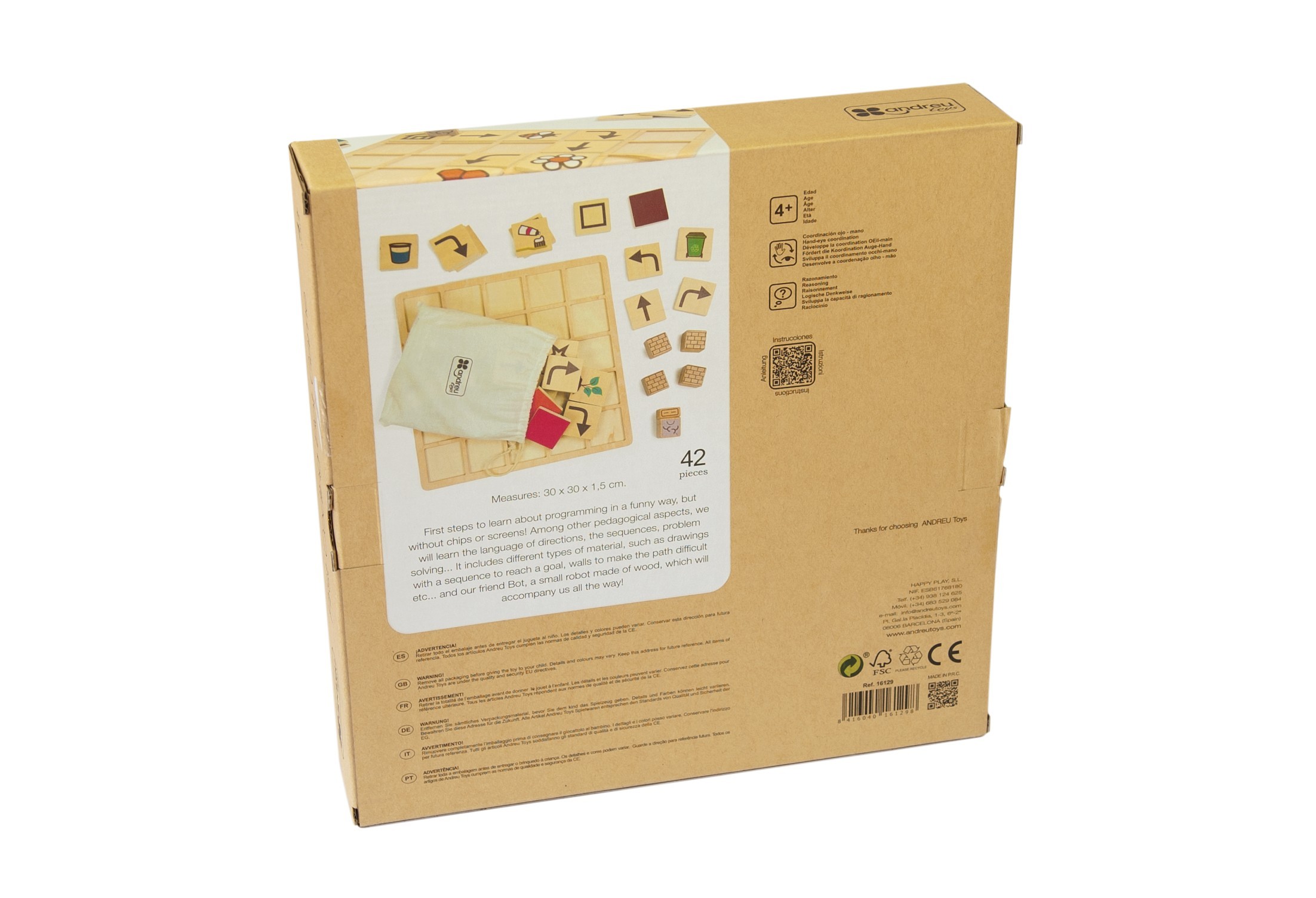 Primeros pasos para aprender sobre la programación de una forma divertida> pero sin chips ni pantallas! Entre otros aspectos pedagógicos aprenderemos el lenguaje de direcciones> las secuencias> la resolución de problemas… Incluye diferentes tipos de material> como dibujos con una secuencia para llegar a un objetivo> muros para dificultar el camino… Todo ello lo haremos con nuestro pequeño amigo “Bot”> un robot de madera que nos acompañará durante todo el juego!