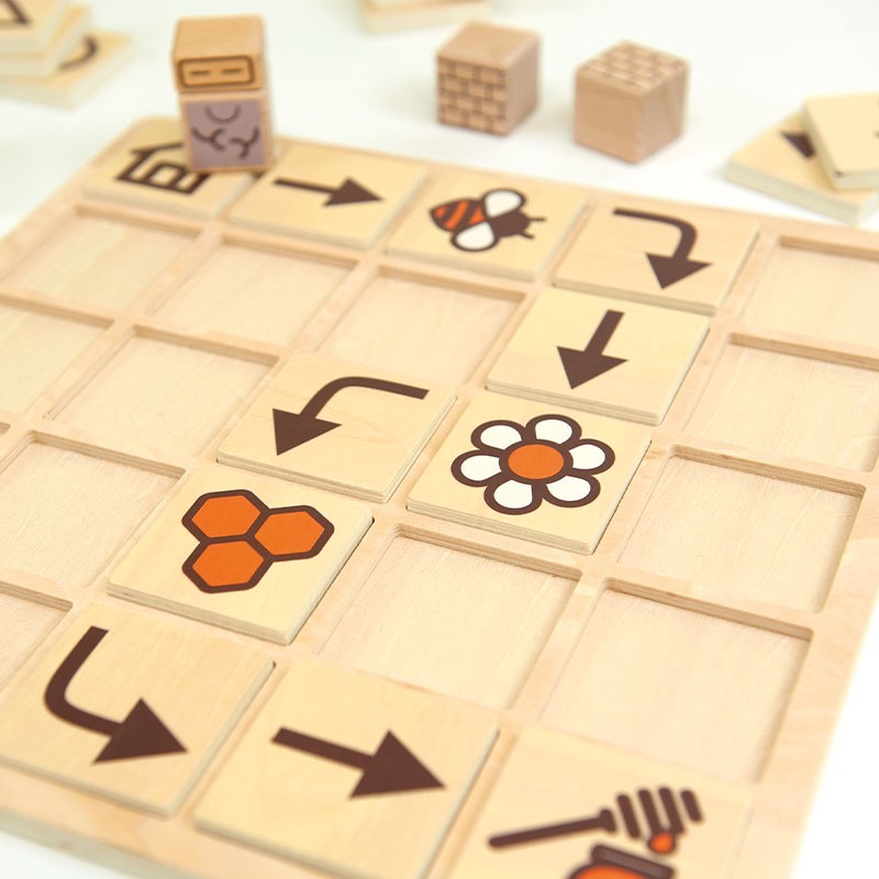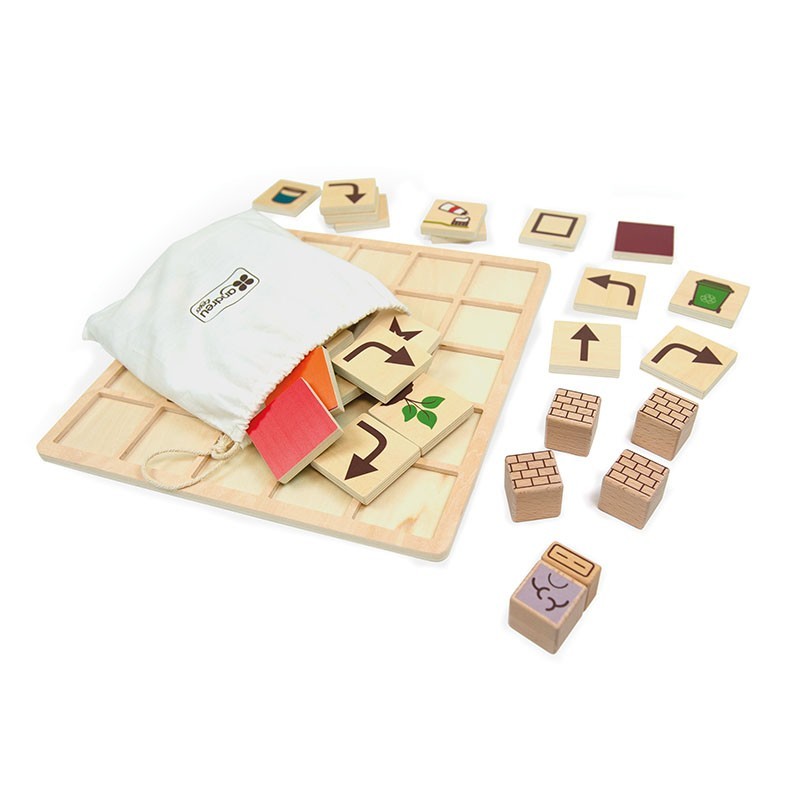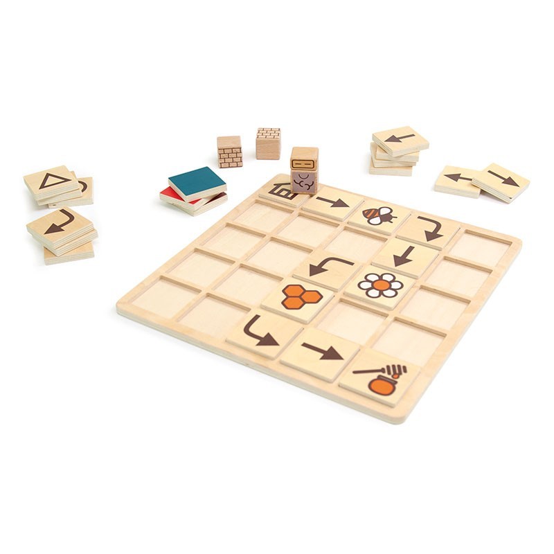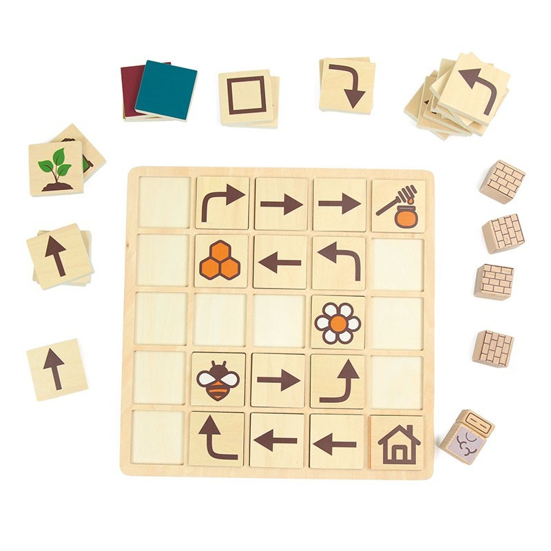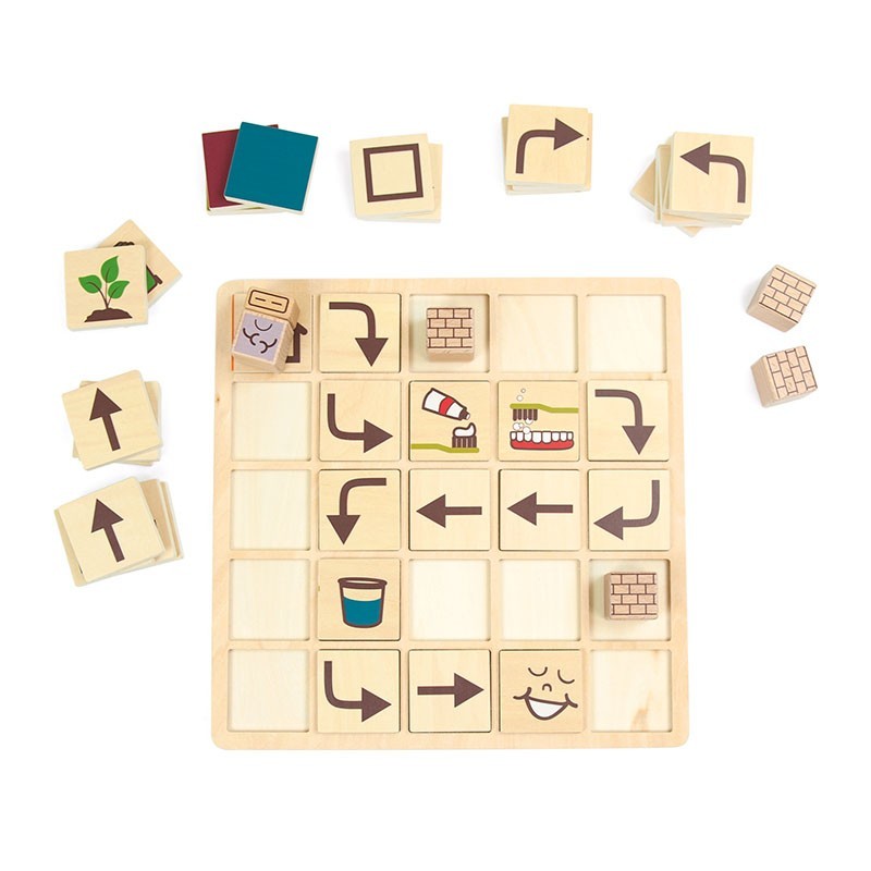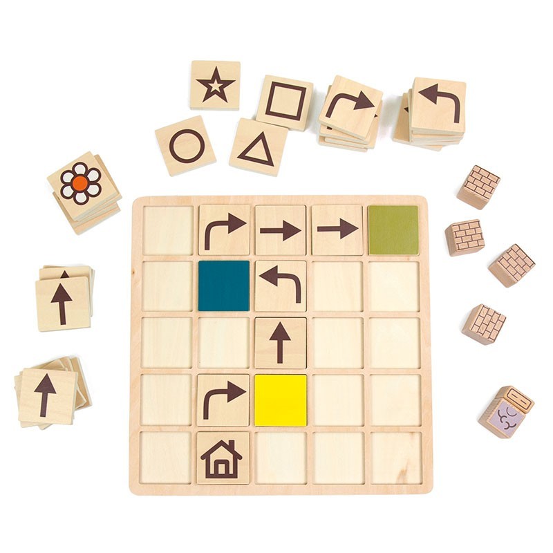 Primeros pasos para aprender sobre la programación de una forma divertida> pero sin chips ni pantallas! Entre otros aspectos pedagógicos aprenderemos el lenguaje de direcciones> las secuencias> la resolución de problemas… Incluye diferentes tipos de material> como dibujos con una secuencia para llegar a un objetivo> muros para dificultar el camino… Todo ello lo haremos con nuestro pequeño amigo “Bot”> un robot de madera que nos acompañará durante todo el juego!