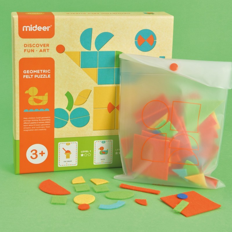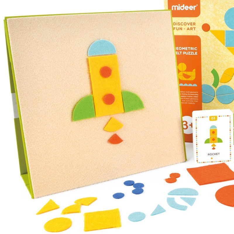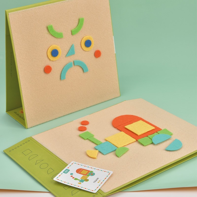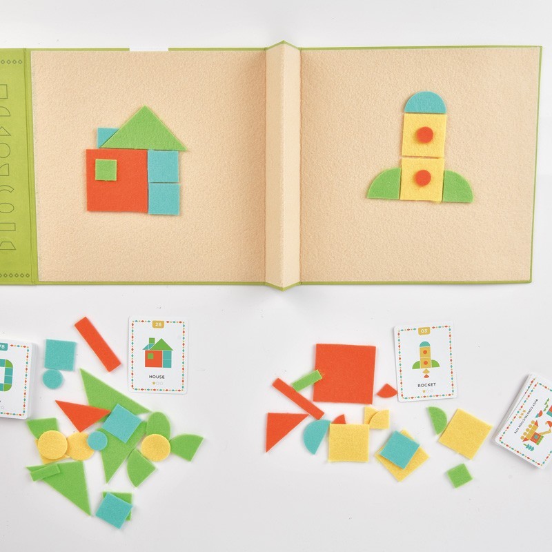 Crea figuras geométricas con fieltro en el tablero de doble cara o reproduce los dibujos de las plantillas> con 3 niveles de dificultad> para desarrollar el razonamiento lógico y la imaginación. Contiene 120 ejemplos> tablero y 157 piezas geométricas de fieltro.
