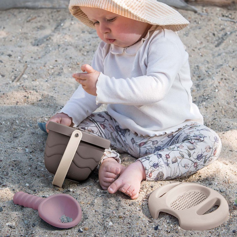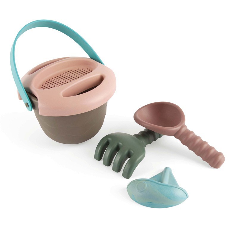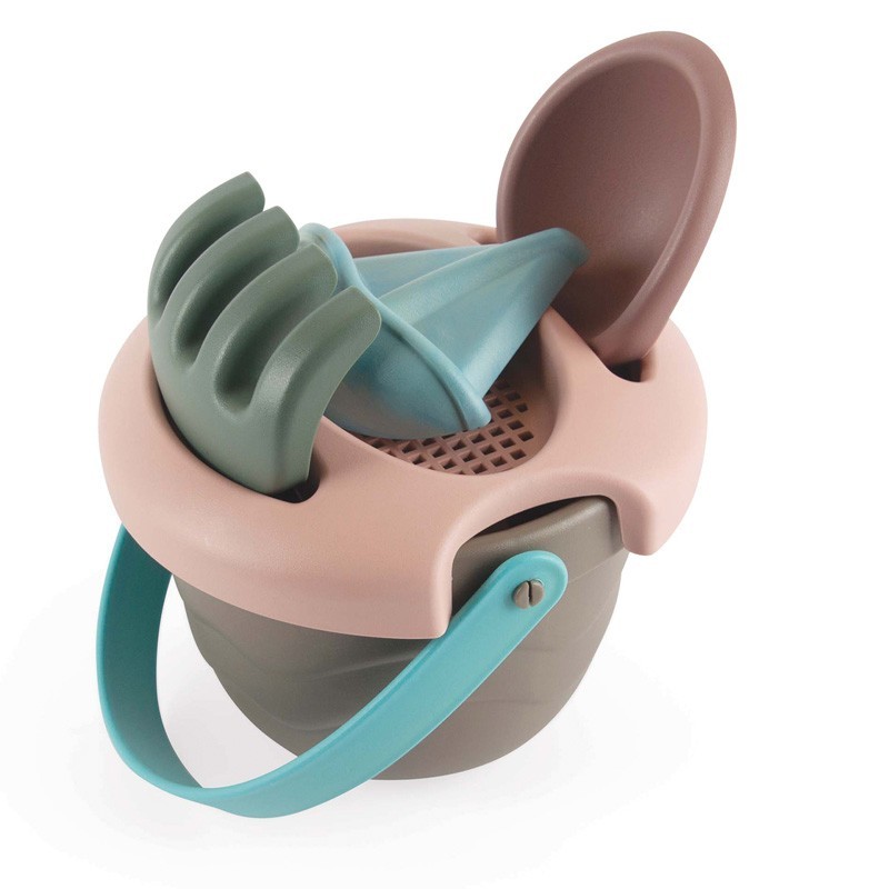 Conjunto cubo de 5 piezas para playa y arenero. Plástico reciclado 100%. Los colores pueden variar.