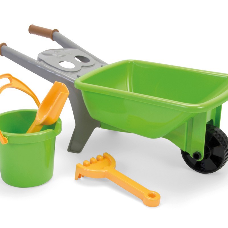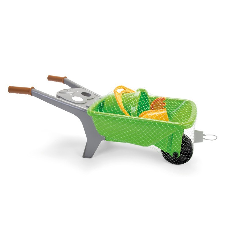 Carretilla con cubo> pala y rastrillo.