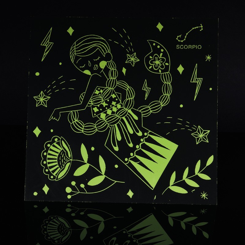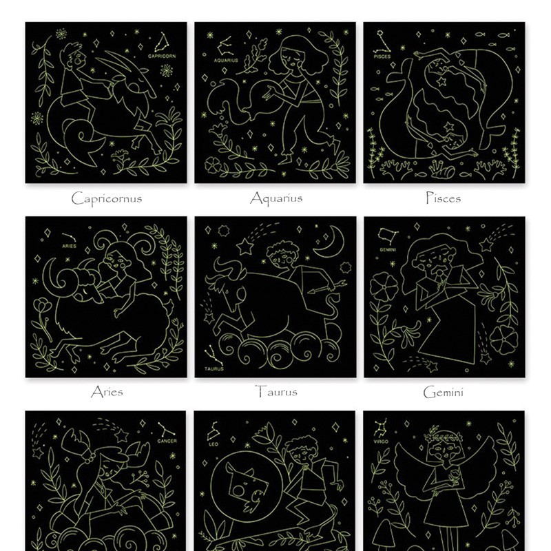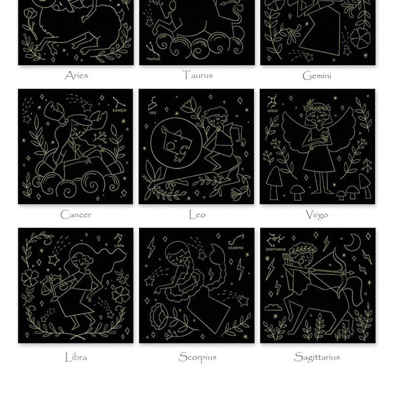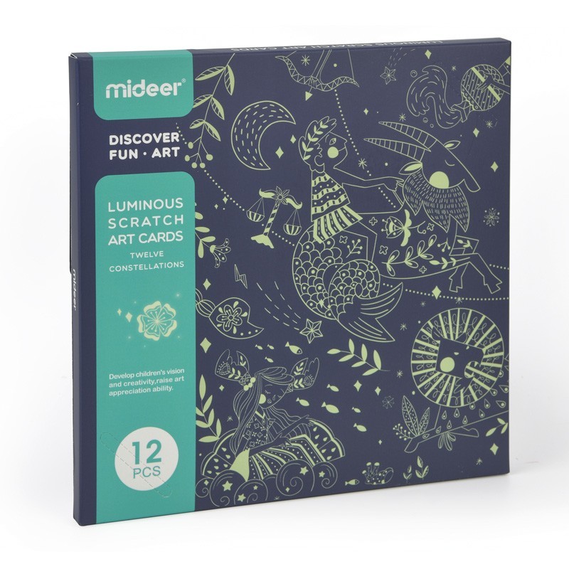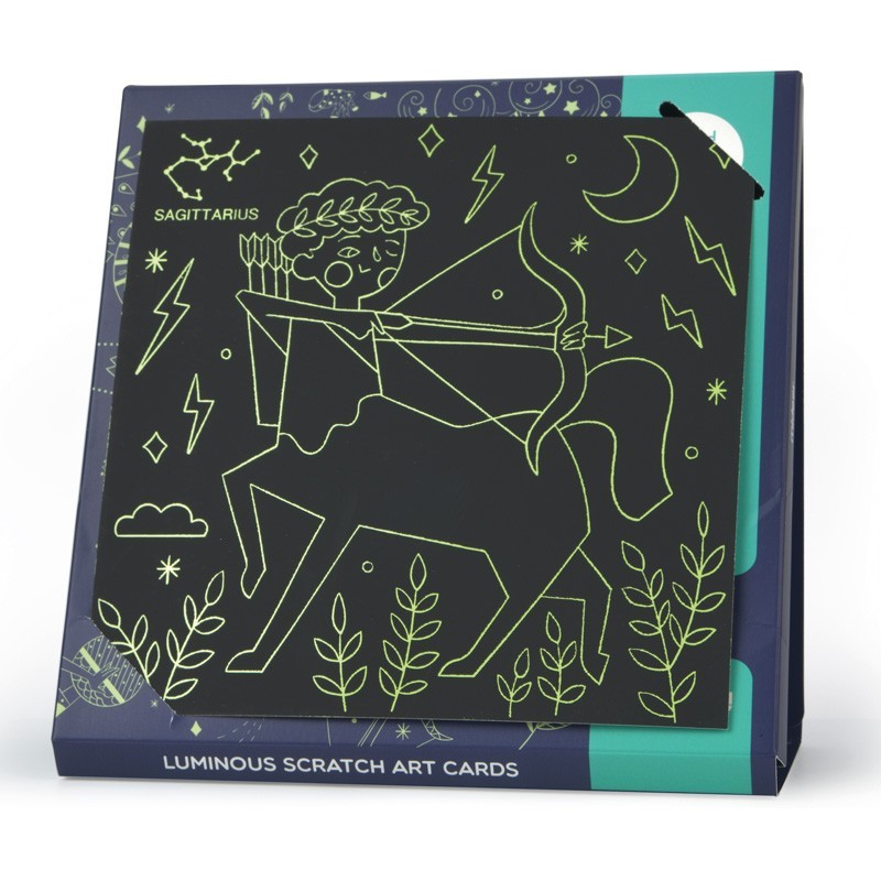 Usa el lápiz de bambú para rascar suavemente los dibujos del cartón. El color florescente aparecerá ante ti! Desarrolla la visión y la creatividad de los niños> aumenta la capacidad de apreciación del arte. Usa la caja como soporte para mostrar los dibujos. Incluye 1 lápiz de bambú y 12 dibujos del zodíaco para rascar.