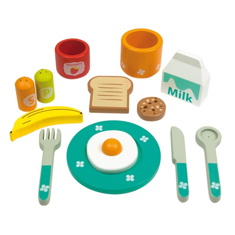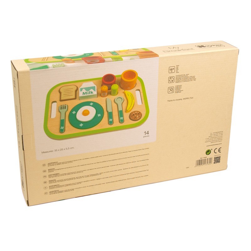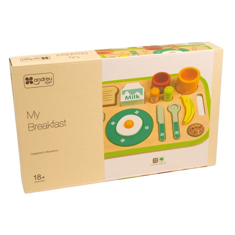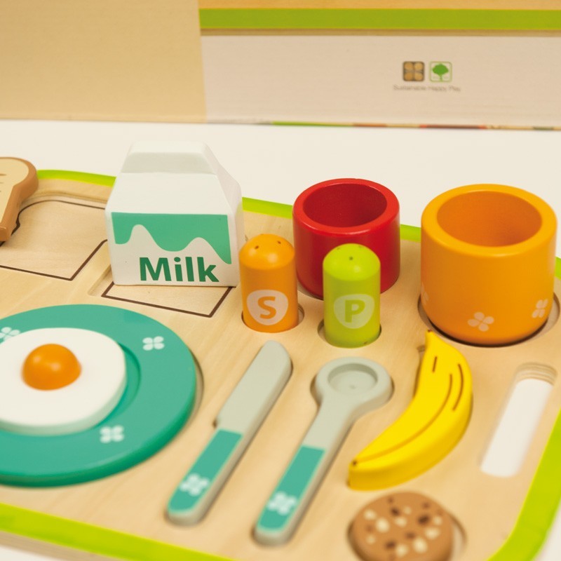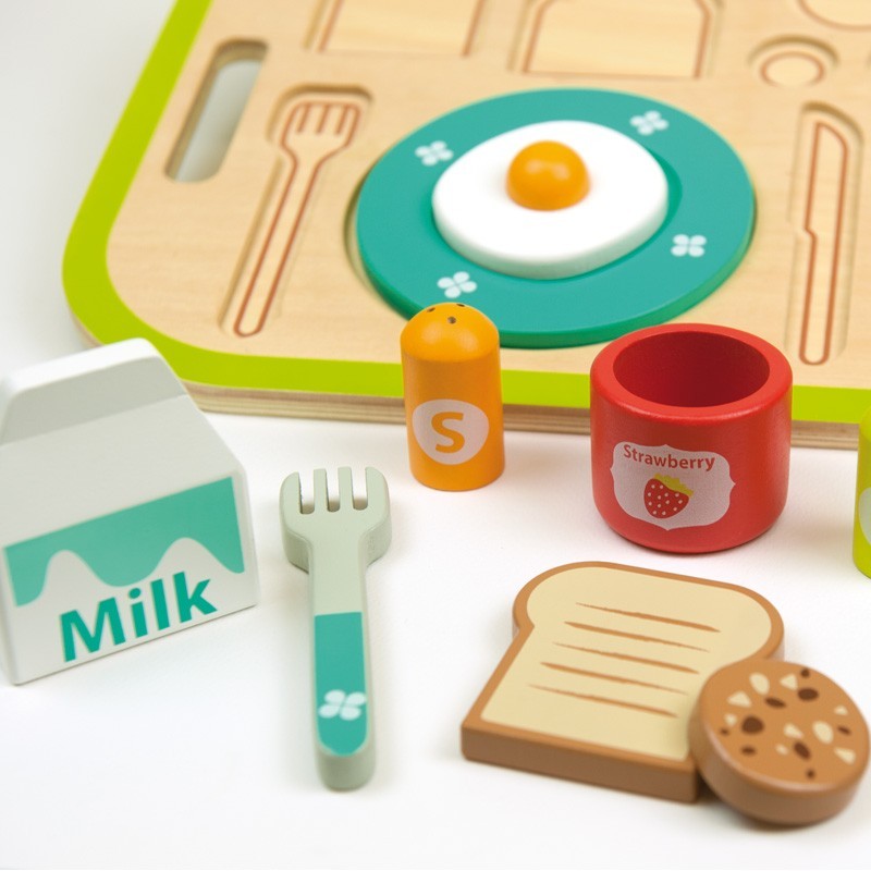 Cookies> leche> tostada con huevo frito> banana> … Juega a preparar un fantástico desayuno con esta bandeja y todos sus complementos.