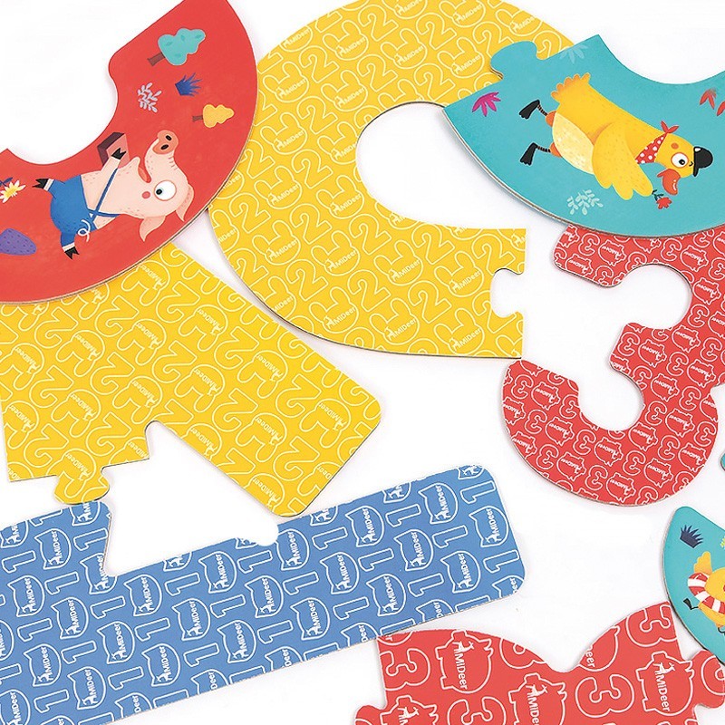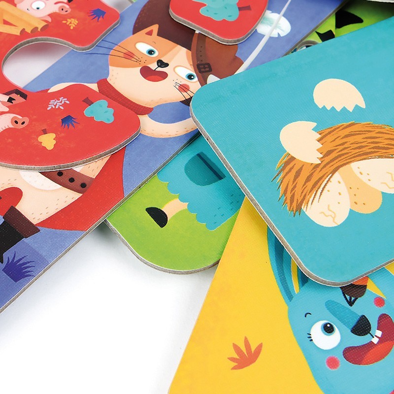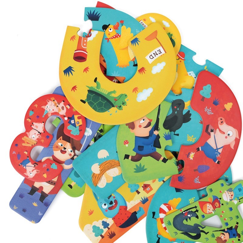 Aprende los números y a contar divirtiéndote con este puzzle progresivo de 15 piezas gigantes. Representan 5 cuentos tradicionales. Aprende el concepto de pequeño a grande.