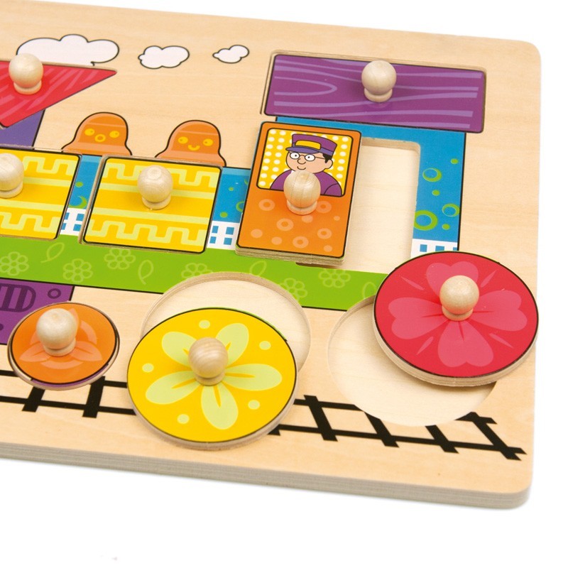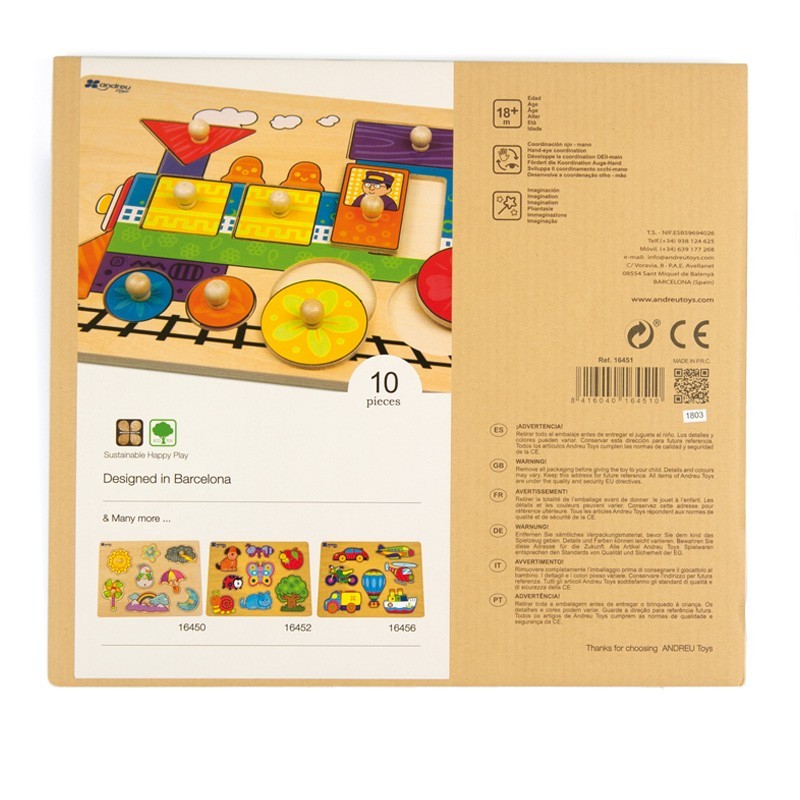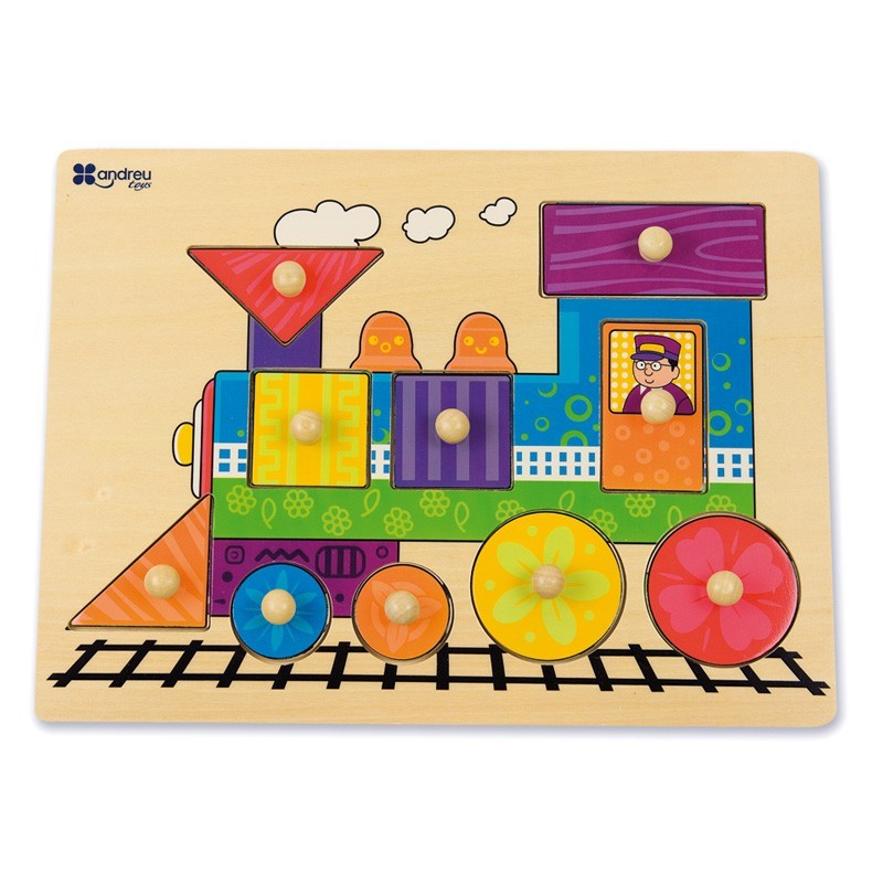Encaje con 10 piezas de formas geométricas para trabajar los conceptos de triángulos> rectángulos> cuadrados> circunferencias> tamaños y colores. Pivotes de madera.SERIE ENCAJES: Ref. 16450 – 16457
