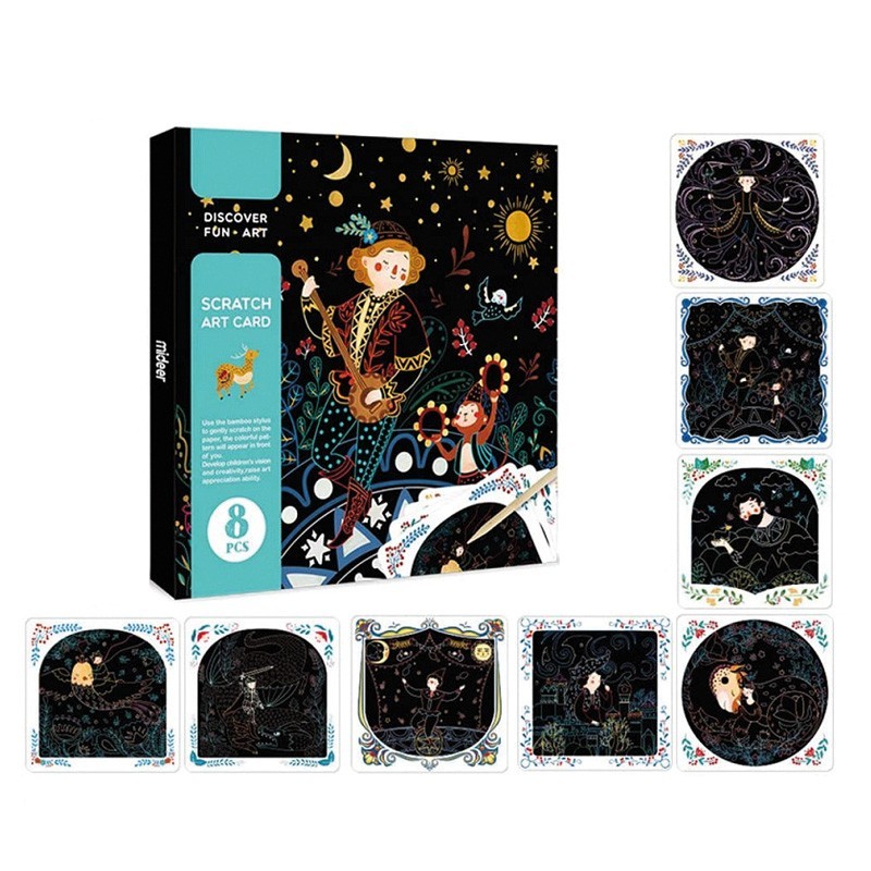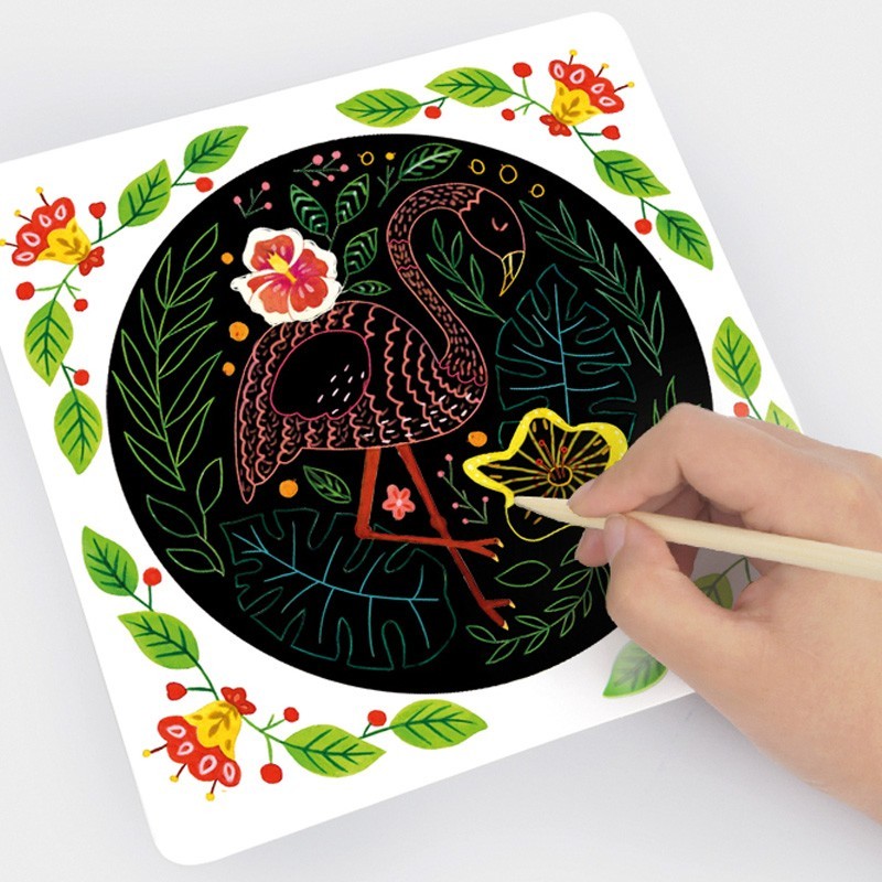 Usa el lápiz de bambú para rascar suavemente el cartón. Los colores apareceran frente a ti. Desarrolla la visión y la creatividad de los niños> aumenta la capacidad de apreciación del arte. Los colores brillantes se esconden debajo del revestimiento mate. Incluye 1 lápiz de bambú y 8 dibujos ilustrados.