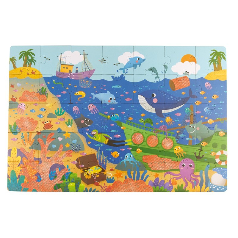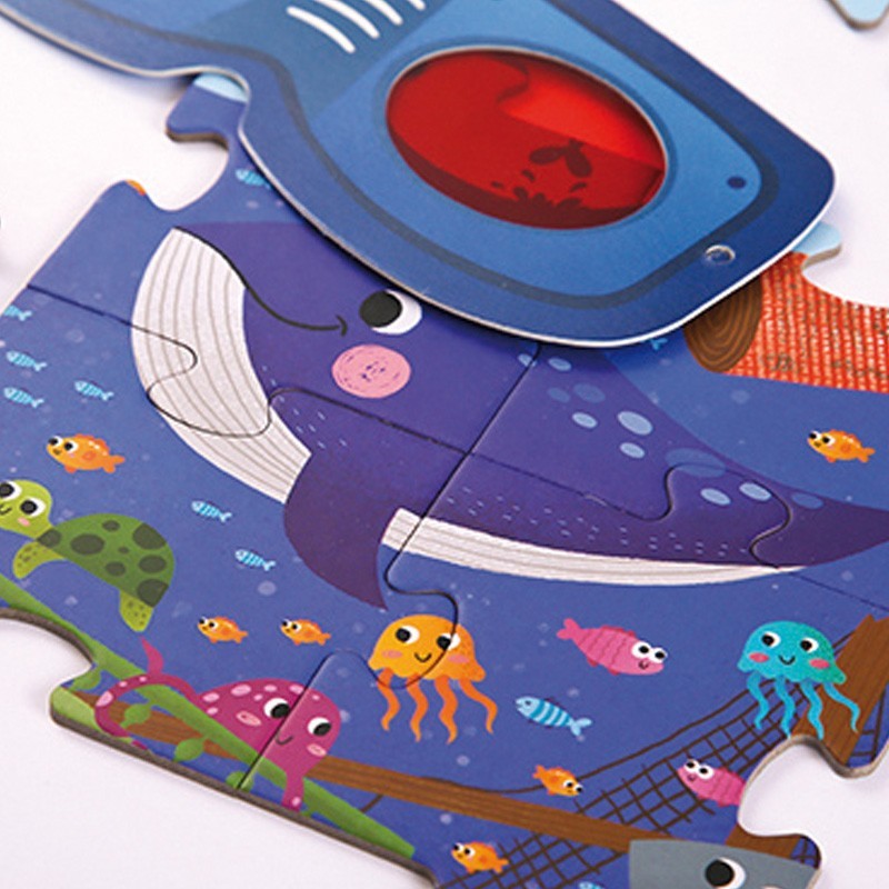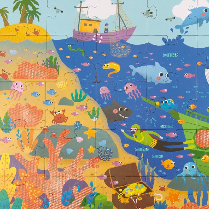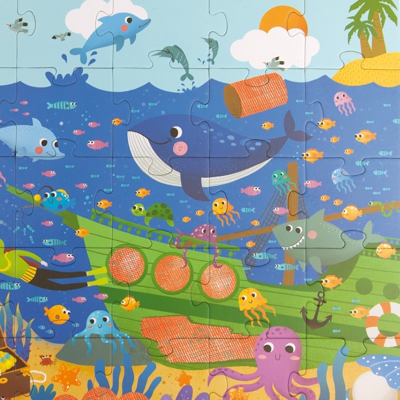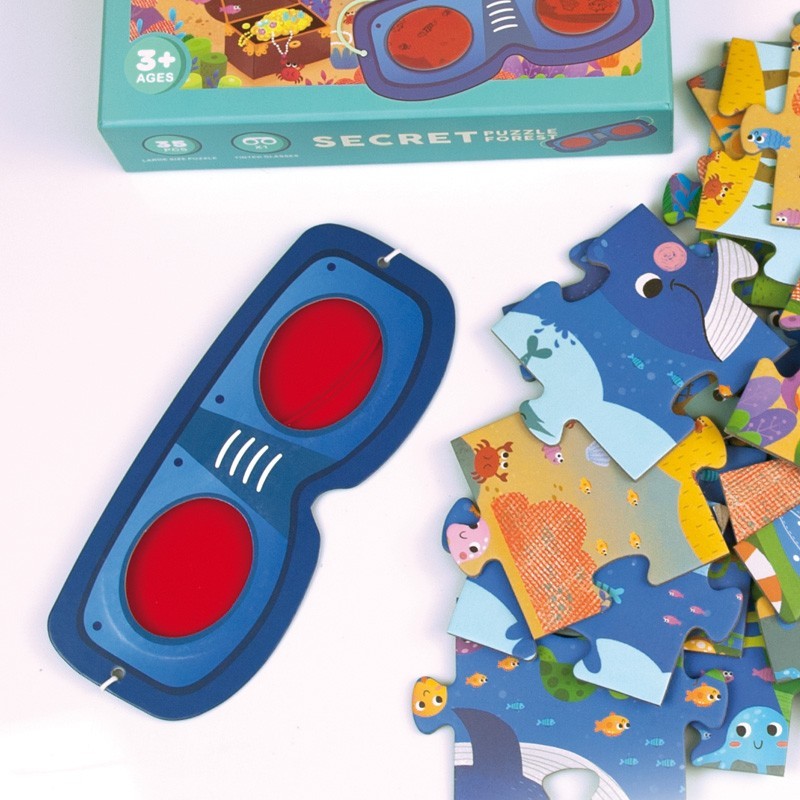 ¡Reconstruye el puzzle de 35 piezas y descubre todos los secretos del océano> ocultos en el agua> usando las gafas de lentes especiales incluídas! Un divertido juego que estimula la atención y la curiosidad de los niños. Hecho con cartón de alta calidad. Tamaño pieza de 8-12cm. Medidas del puzzle: 60 x 40 cm.