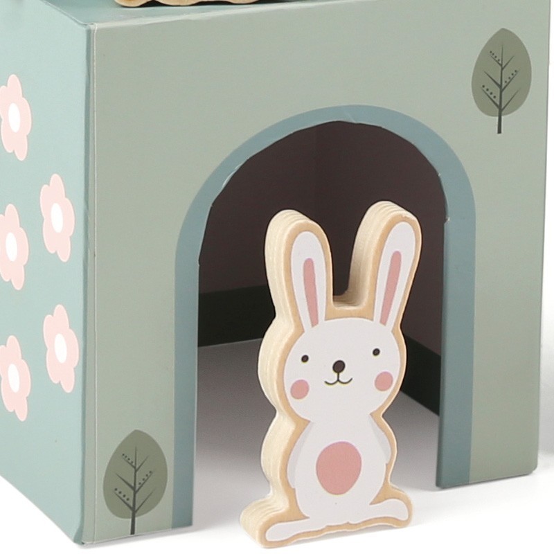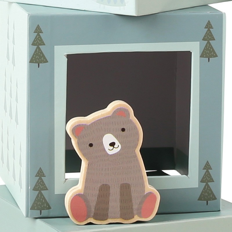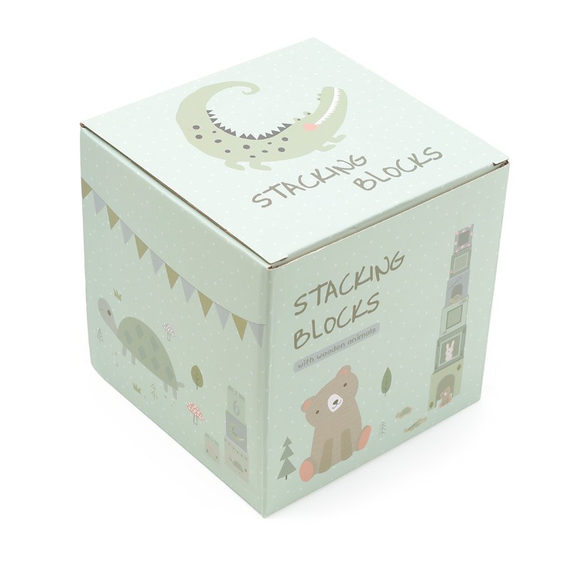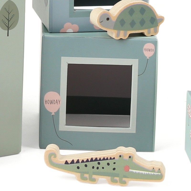 10 Cubos apilables de cartón + 4 animales de madera. Medidas de los animales: tortuga de 6 cm. osito de 7>5 cm. cocodrilo de 9 cm. conejo de 8>5 cm. Grosor piezas de: 1 cm. 10 cubos de 3>5 / 4>5 / 6 / 7 / 8 / 9 / 10 / 11>5 / 12>5 / 13>5 cm.