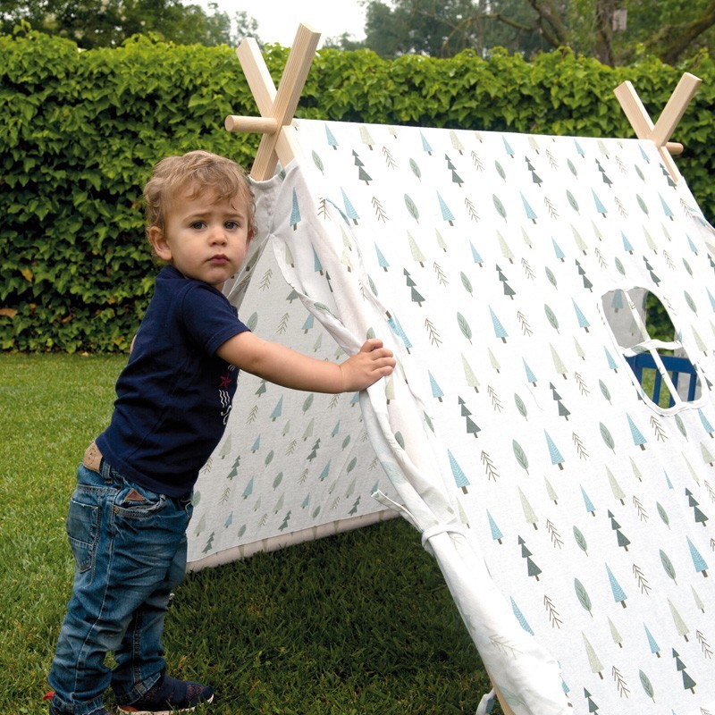 Tipi de tela y madera. Medidas 112 x 117 x 105 cm.