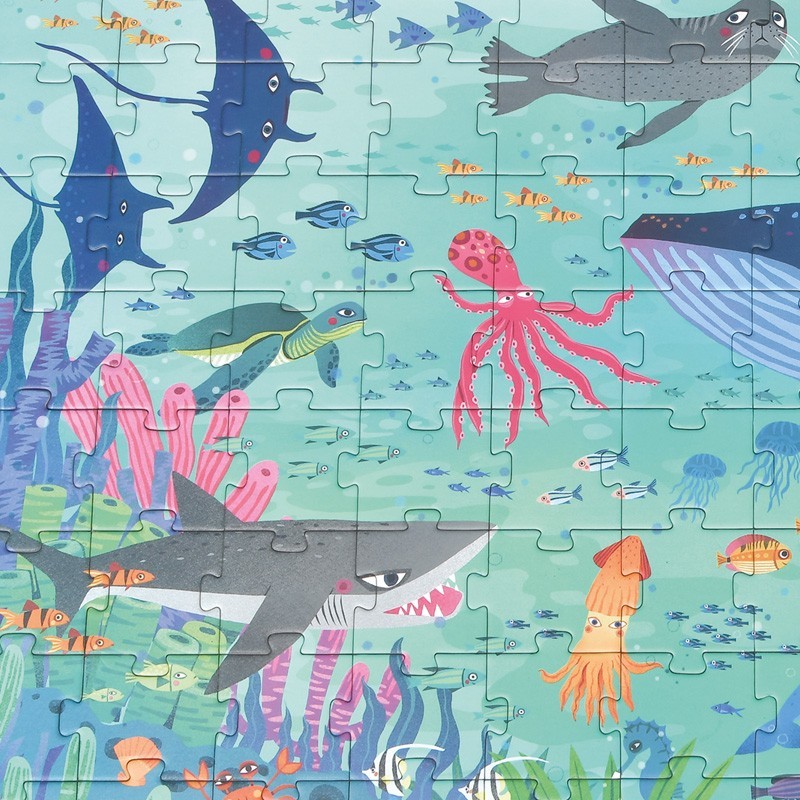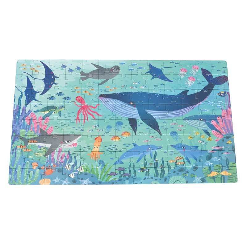 Puzzle de 104 piezas con ilustración de animales marinos. Tamaño del puzzle montado de 70cm x 40cm. Medida de la pieza 7x5cm. Incluye una guía.
