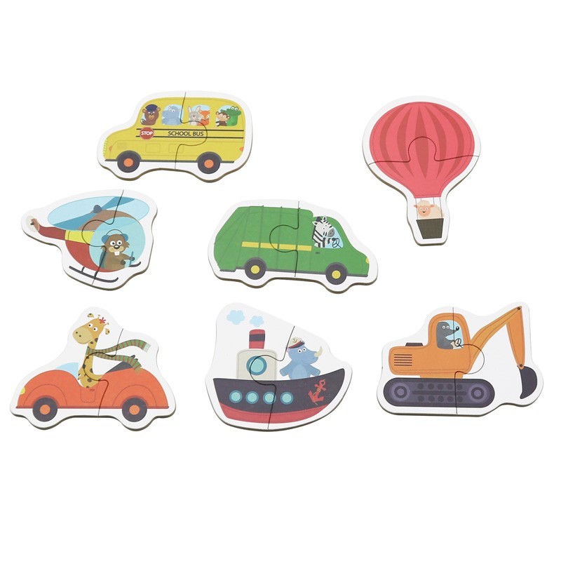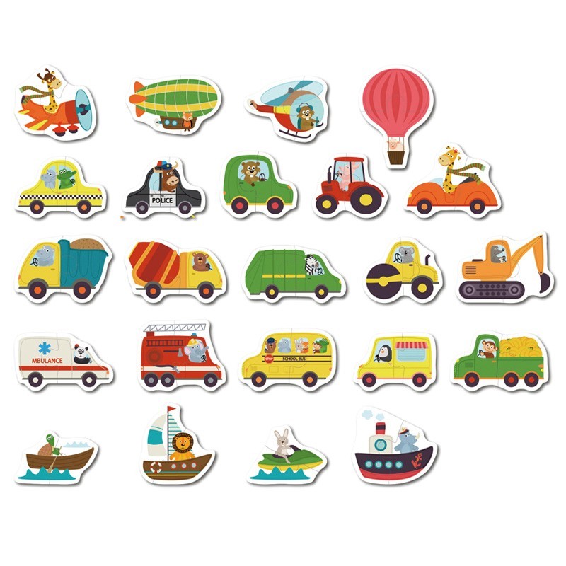 23 puzzles de 2 piezas> con dibujos de vehículos. Fabricados en cartón prensado.
